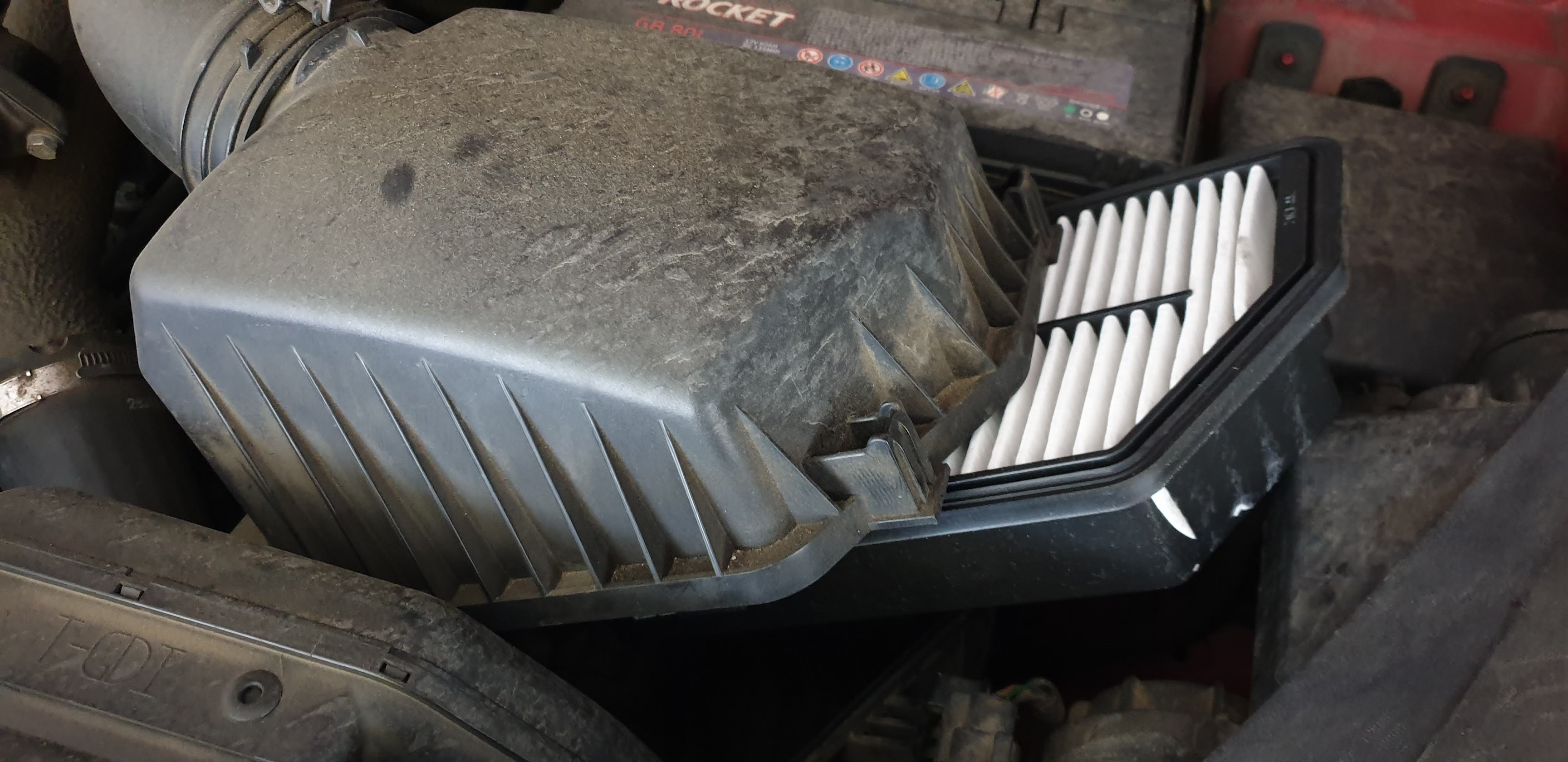 차량 본넷을 열고 오른쪽 배터리 앞 부분에 위치한 에어필터 하우징을 엽니다.